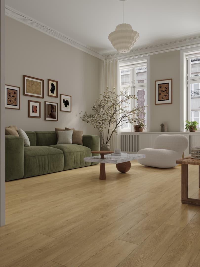 Напольное покрытие «Миндаль» имеет светло-коричневый оттенок с видимыми узорами древесных волокон и текстурными деталями, которые создают эффект натурального дерева. Благодаря своему природному происхождению, светлый пастельный оттенок с характерным желтоватым подтоном гармонично сочетается с различными материалами, будь то древесина или текстиль. Такой пол создает ощущение безопасности и комфорта, что особенно важно при оформлении интерьера в жилых помещениях.